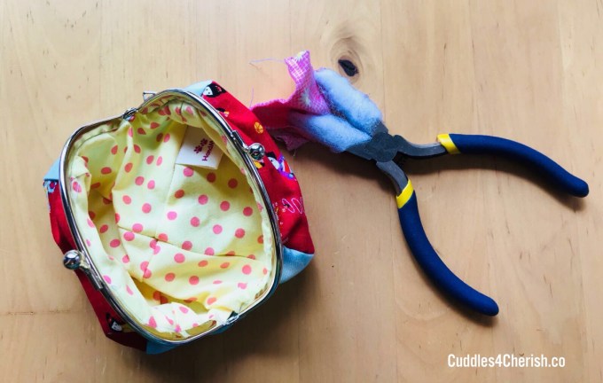 Now comes the toughest part.. using pliers to fix the metal clasp onto the sewn purse pouch was really a test of my grip strength.
