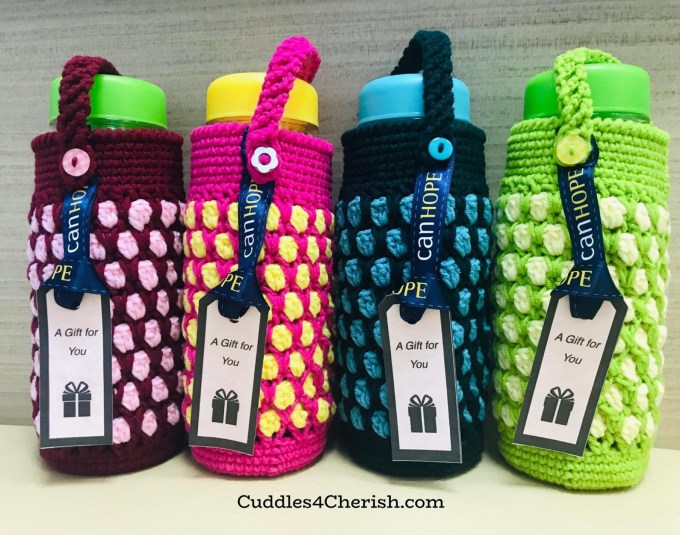 The month of October is dedicated solely to Our Children. It also marks the end of my Water Bottle Cozy projects for the Year 2019. It had been an enjoyable craft spanning through these last 6 months. Dabbling with textured crochet stitches and exploring how various colours can complement each other to help bring out the best of each water Bottle Cozy. Even incorporating Math into my Crochet projects. From simple counting of stitches to pythagoras’ theorem , to the study of proportion and gauge to make various Water Bottles Cozies that will fit water bottles of different dimensions snuggly.
